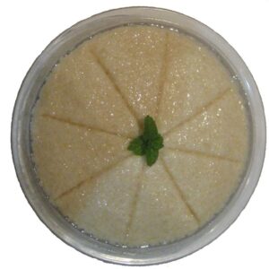 Mix very thoroughly the desiccated coconut, the coconut cream and the sugar syrup with the rice. Spread the mixture onto a flat dish and glaze the surface with the dsp of dissolved sugar using a spatula. Score the surface with radial lines and decorate with a sprig of mint.